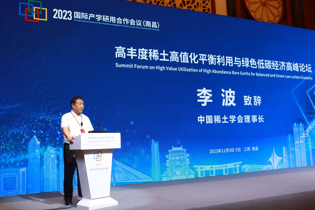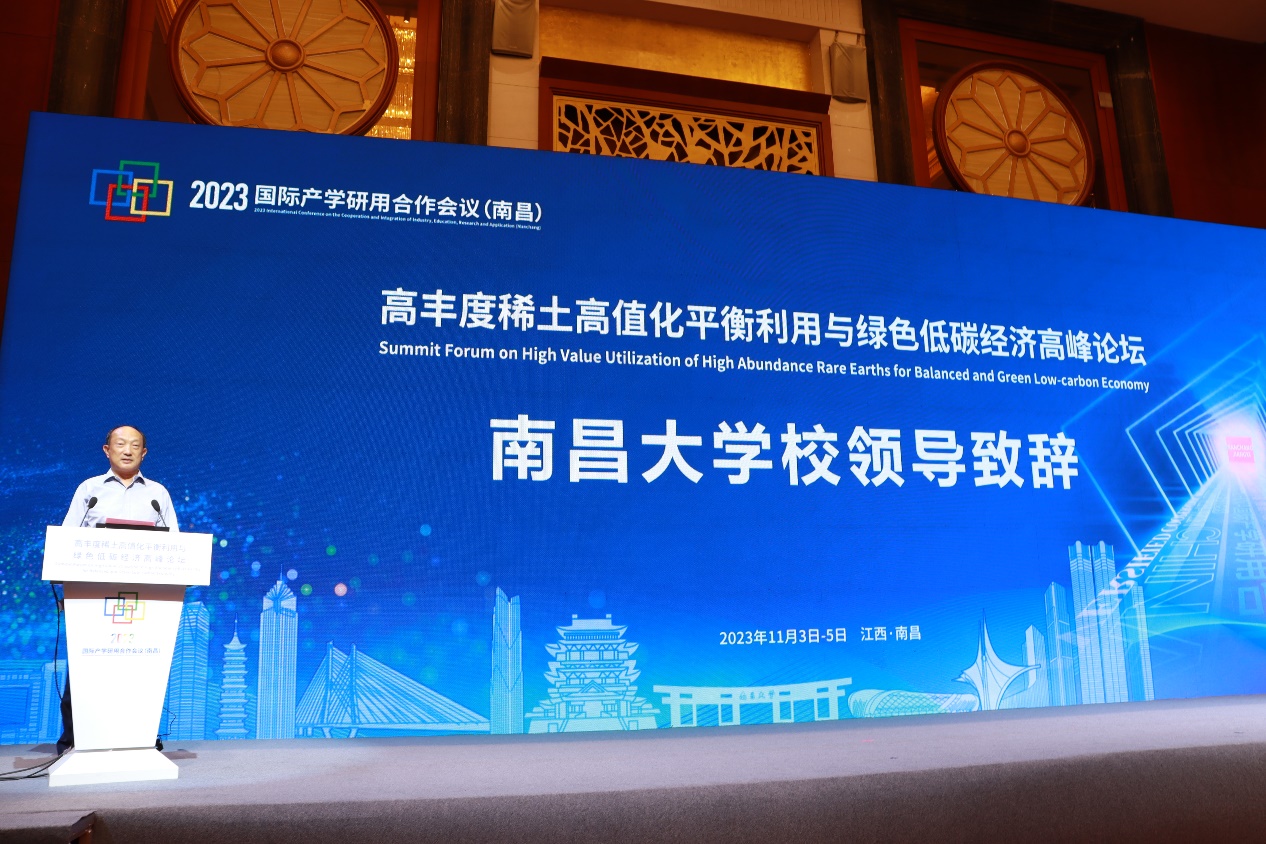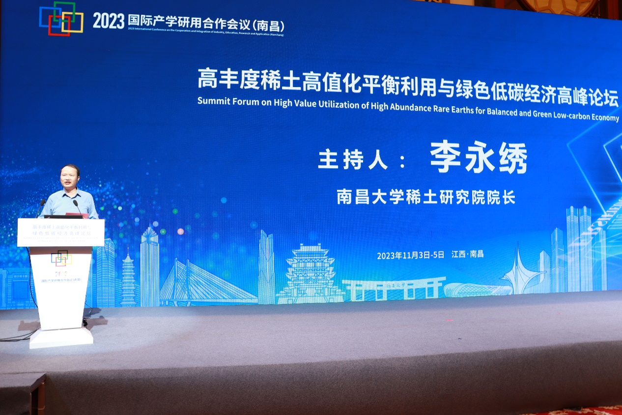 From November 3 to 5, 2023, the High-Value Balanced Utilization of Abundant Rare Earths and Green Low-Carbon Economy Forum, a sub-forum of the International Conference on Industry-Academia-Research-Application Cooperation, was held in Nanchang. The forum was hosted by the School Planning and Development Center of the Ministry of Education, organized by the People’s Government of Jiangxi Province and Nanchang University, and co-organized by the Chinese Society of Rare Earths and the China Rare Earth Industry Association.